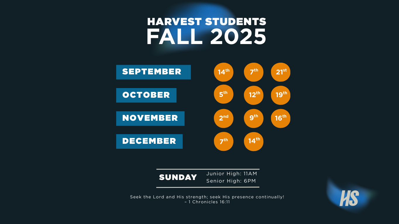 Both Senior High and Junior High follow our Small Group schedule of 3 weeks on, 1 week off.